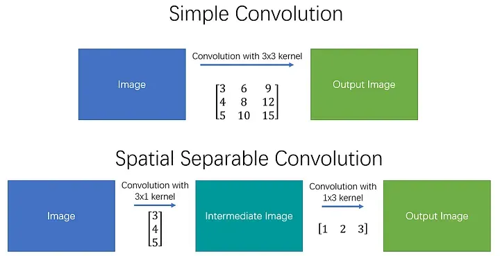 In real-life applications, a convolution operator is a lot “cheaper” than having a fully connected layer. However, there is a way to make it even more efficient, by introducing spatial separable convolutions. The mathematical concept of convolution allows us to separate our kernel into two linear kernels and apply them consequently to receive the same result.