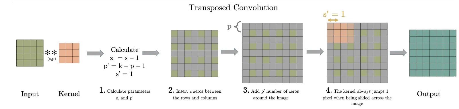 - Place s - 1 number of zeros between each pixel of input, where s is the stride of our regular convolution.