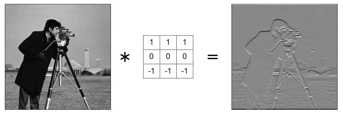 Another use for convolution operations is edge detection. In images, edges are sudden changes in pixel values. That being said, you can identify an edge by subtracting two-pixel values from each other. If the difference is large then it is an edge! Here you can see two examples of edge detection, horizontal edges detection, and vertical edges detection.