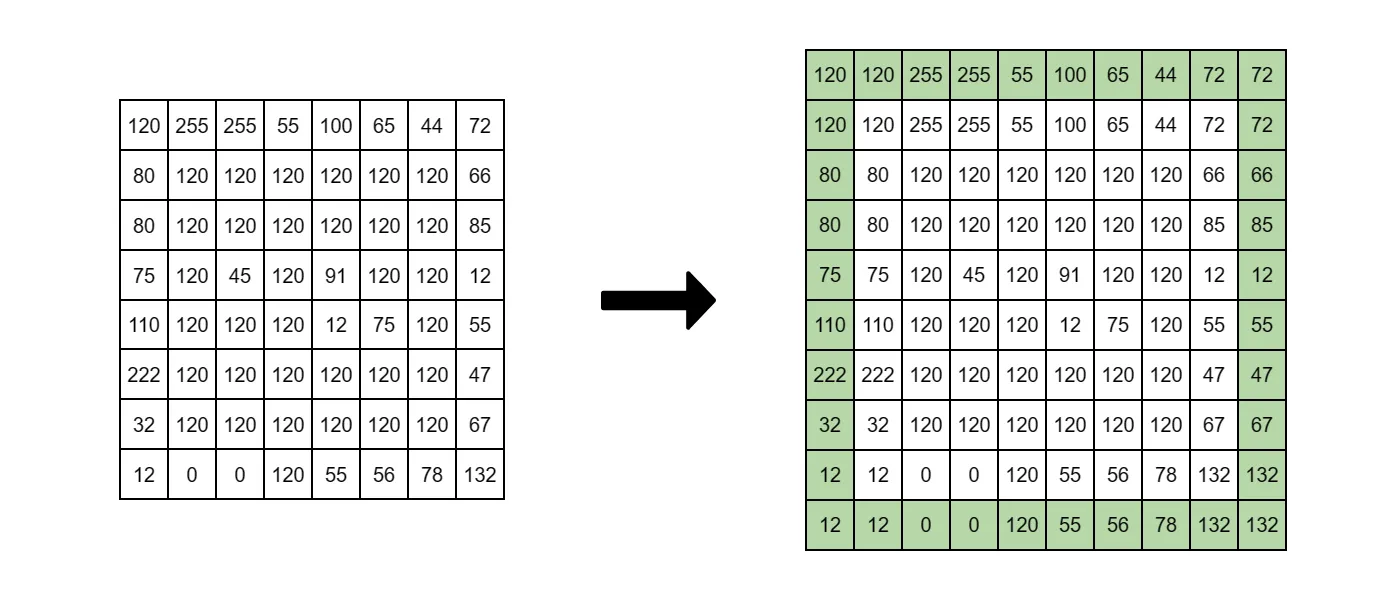 Padding suggests filling the edges of an image with temporal values. Applying it lets you provide the missing values to compute an output properly. There are multiple ways of performing padding, so let’s closely examine them.
