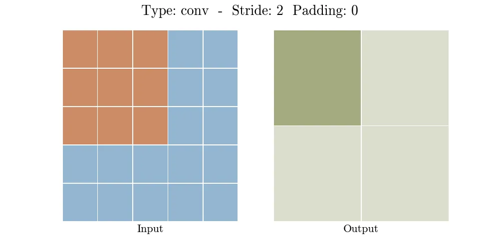 Now, let's see how stride affects our output by increasing it to 2. Now the output dimensions are: