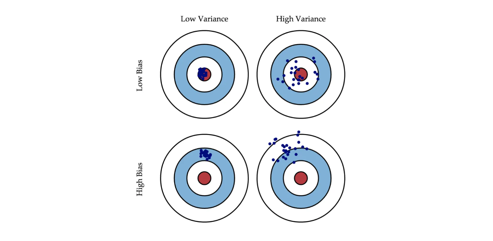 As you can see, having a high bias means that the model's predictions will be far from the center, which is logical given the bias definition. With variance, it is trickier as a model can fall both relatively close to the center as well as in an area with large error.