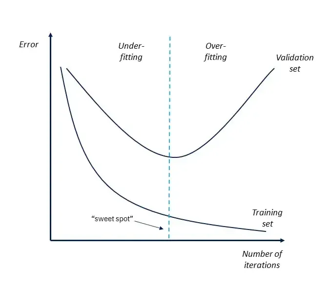 If the curves show a descending trend, your model is training. At some point, you might see that the training loss starts approaching zero while the validation loss suddenly rises. This is precisely where the model stopped extracting the general pattern (got fit) and started overfitting. So, the “sweet spot” to stop the training is right before the validation curve starts ascending.