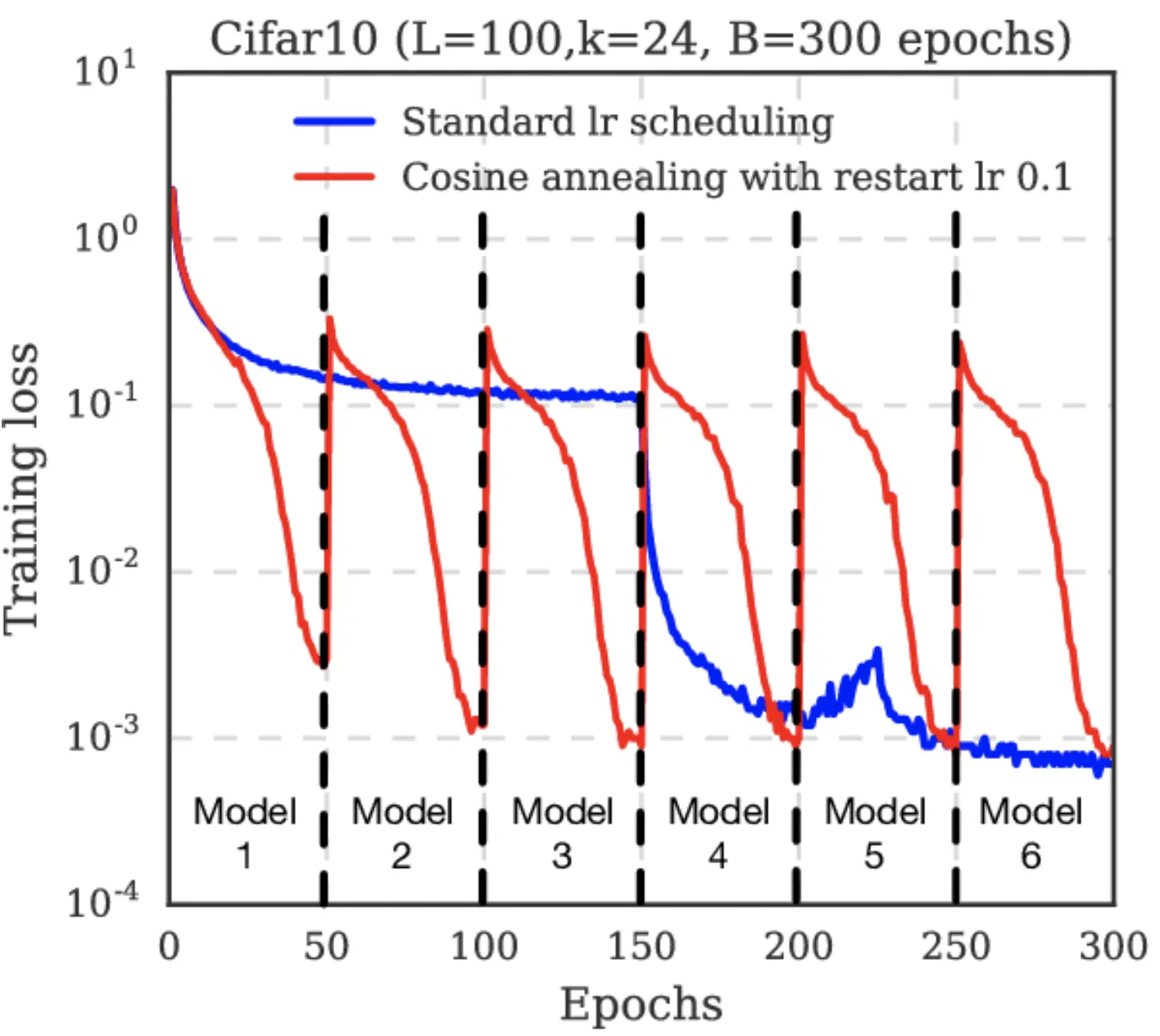 Each time the “restart” occurs, we take the good weights from the previous “cycle” as the starting point. Thus, with each restart, the algorithm approaches the minimal loss closer.