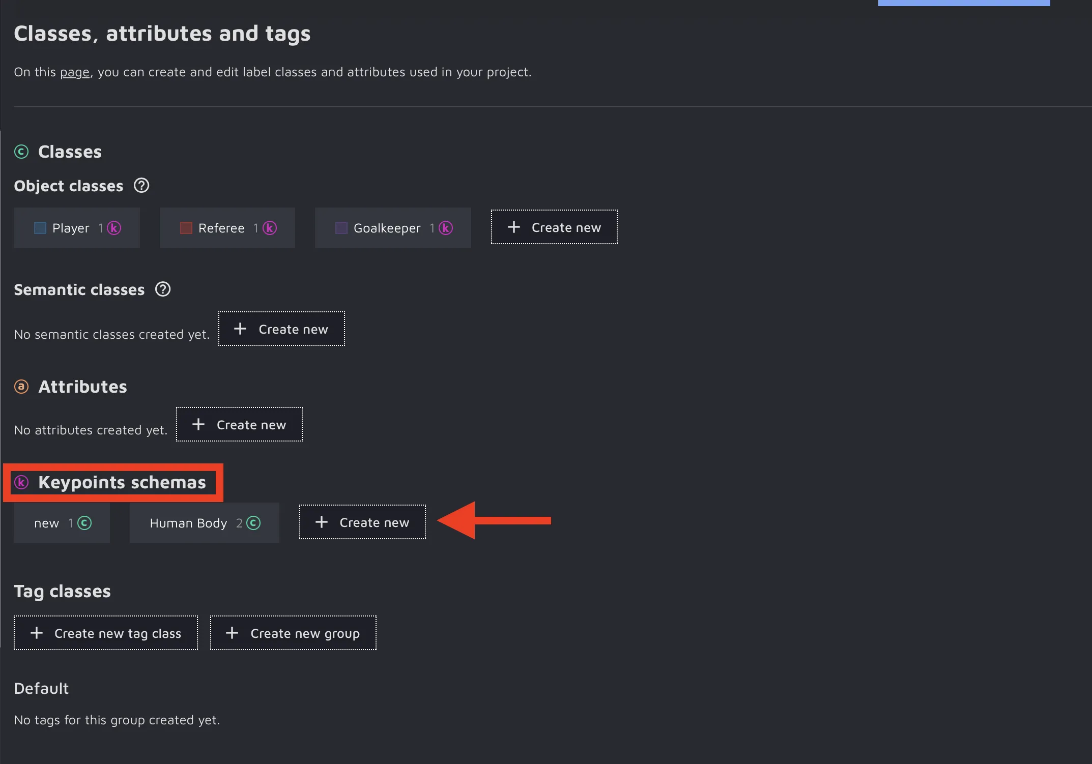 There you should navigate to the Keypoints schemas section and click on the Create new button.