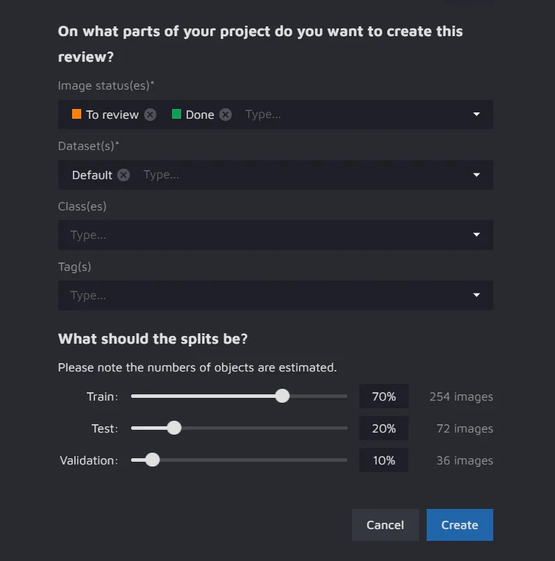- Split percentage ratio - tweak the percentage of images to be divided into the Train, Test, and Validation datasets. The default percentages for the Train, Test, and Validation datasets are 70%, 20%, and 10%, respectively.