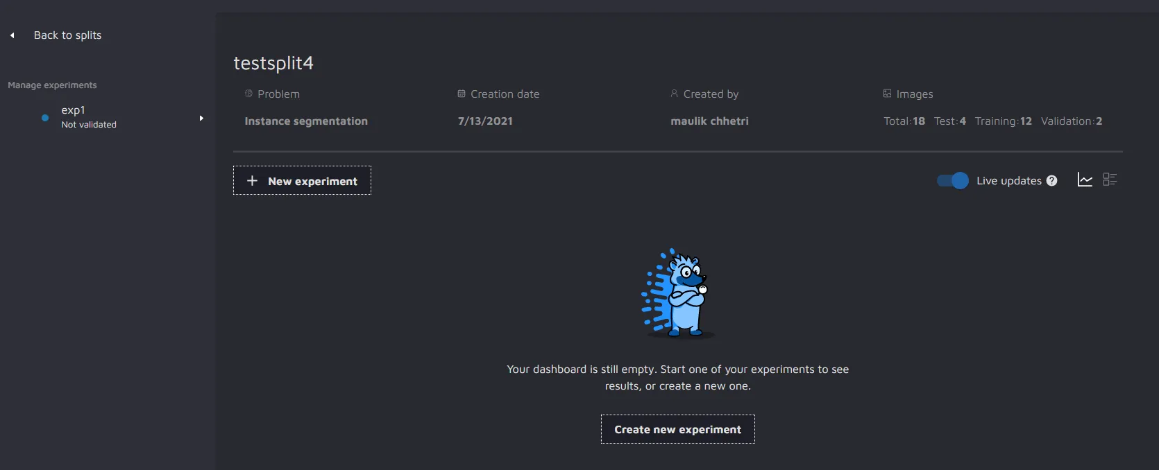 After creating a split for a particular machine learning task with given sets of data, the user is able to see the overview of the split. There can be multiple splits for the same dataset and different tasks. For example, a car dataset with 10000 images can have 8000 images for training, 1000 for testing, and the rest 1000 for validation. It can also have another split with varying numbers of training, testing, and validation data.